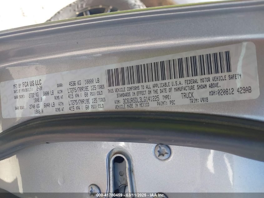 Color SilverCylinders 6Drive Full driveVIN 3C6UR5DL3LG******State Run & Drive VerifiedDamage Right sideAuction date 2025-03-24