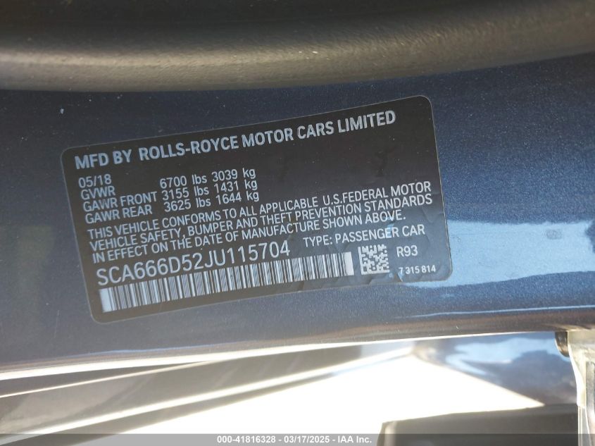 Color WhiteCylinders 12Drive Rear wheel driveVIN SCA666D52JU******State Run & Drive VerifiedDamage Front or backAuction date 2025-03-27