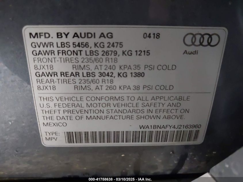 Цвет СерыйЦилиндры 4Привод Полный приводVIN WA1BNAFY4J2******Состояние НеизвестноПовреждения Передняя или задняя AutoRIA