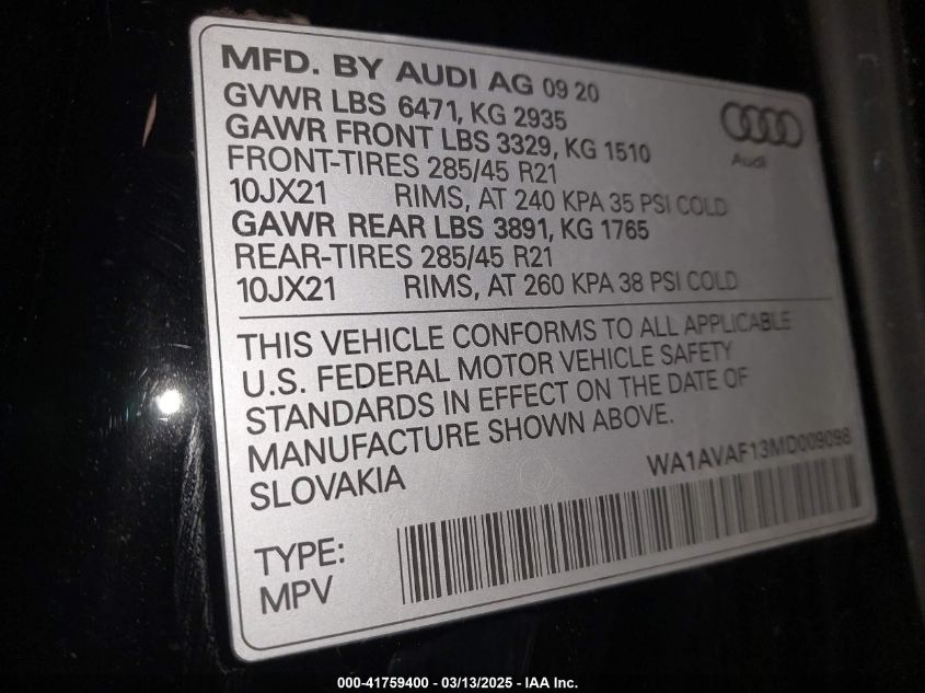 2021 AUDI Q8 2021 року Бензин, 3.0, Полный привод, vin - WA1AVAF13MD****** из США