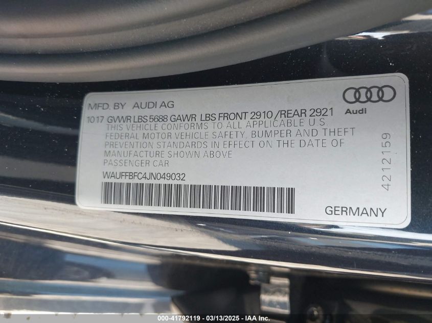 Цвет ЧерныйЦилиндры 8Привод Полный приводVIN WAUFFBFC4JN******Состояние НеизвестноПовреждения Передняя или задняя AutoRIA
