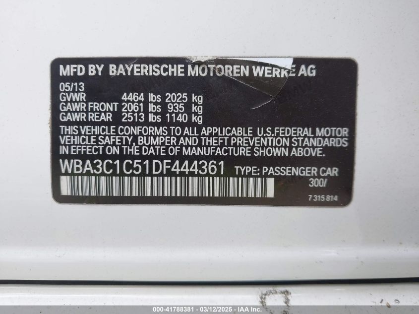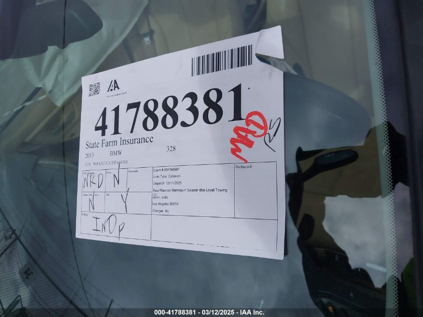 2013 BMW 3 SERIES 2013 року Бензин, 2.0, Задний привод, vin - WBA3C1C51DF****** из США