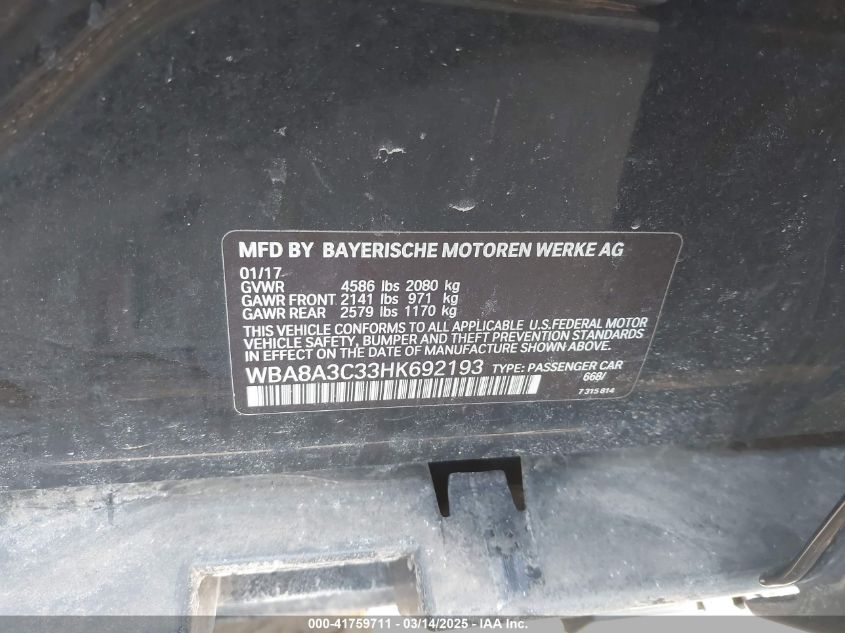 2017 BMW 3 SERIES 2017 року Бензин, 2.0, Полный привод, vin - WBA8A3C33HK****** из США