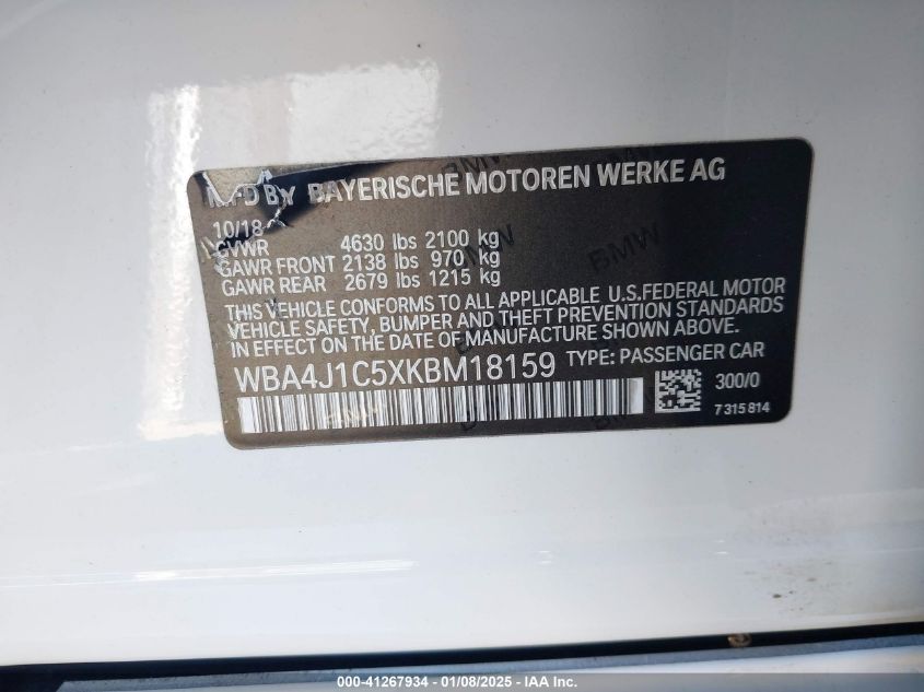 2019 BMW 4 SERIES 2019 року Бензин, 2.0, Задний привод, vin - WBA4J1C5XKB****** из США