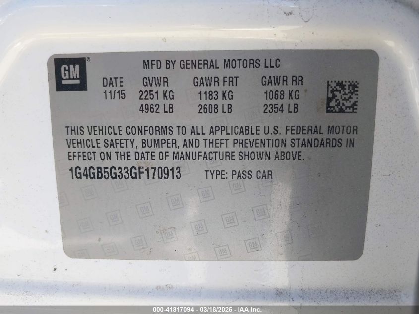 Цвет БелыйЦилиндры 6Привод Передний приводVIN 1G4GB5G33GF******Состояние НеизвестноПовреждения Передняя или задняя AutoRIA