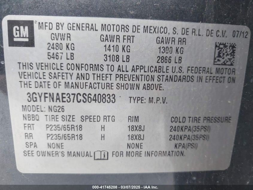Цвет СерыйЦилиндры 6Привод Передний приводVIN 3GYFNAE37CS******Состояние НеизвестноПовреждения Передняя или задняя