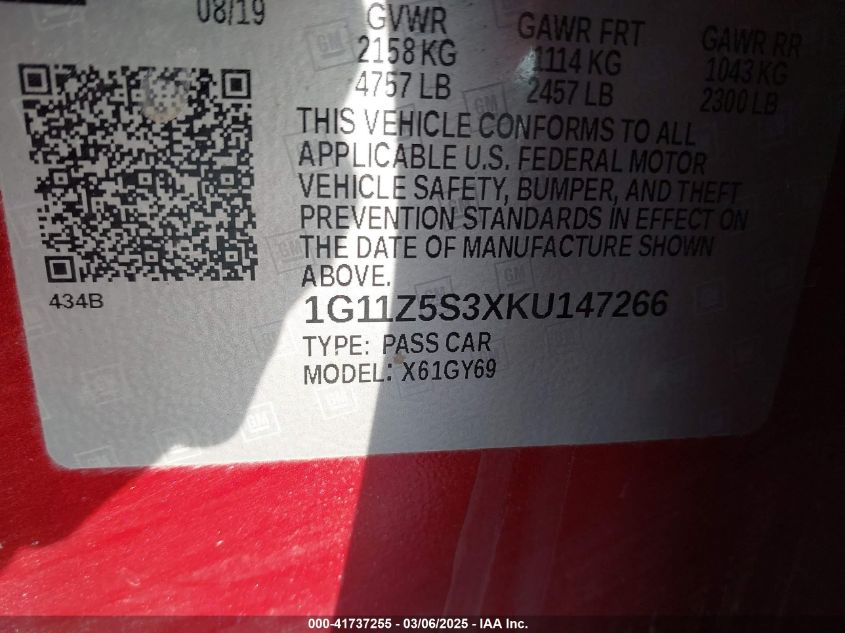 2019 CHEVROLET IMPALA 2019 року Бензин, 3.6, Передний привод, vin - 1G11Z5S3XKU****** из США