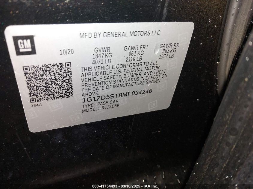 2021 CHEVROLET MALIBU 2021 року Бензин, 1.5, Передний привод, vin - 1G1ZD5ST8MF****** из США