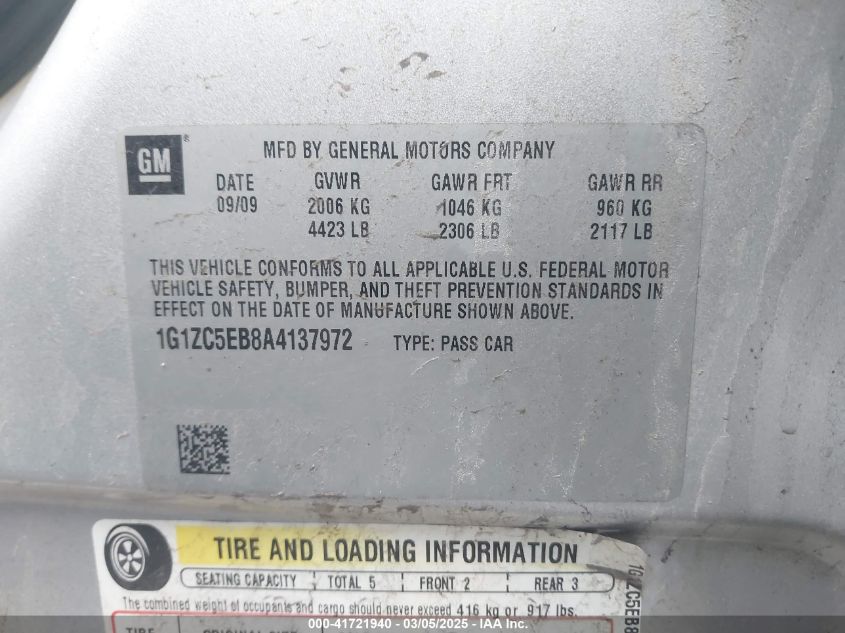 Цвет СеребряныйЦилиндры 4Привод Передний приводVIN 1G1ZC5EB8A4******Состояние НеизвестноПовреждения Передняя или задняя