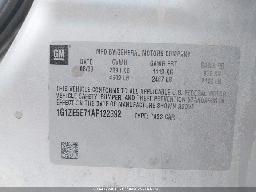 Цвет СеребряныйЦилиндры 6Привод Передний приводVIN 1G1ZE5E71AF******Состояние НеизвестноПовреждения Био/Химические