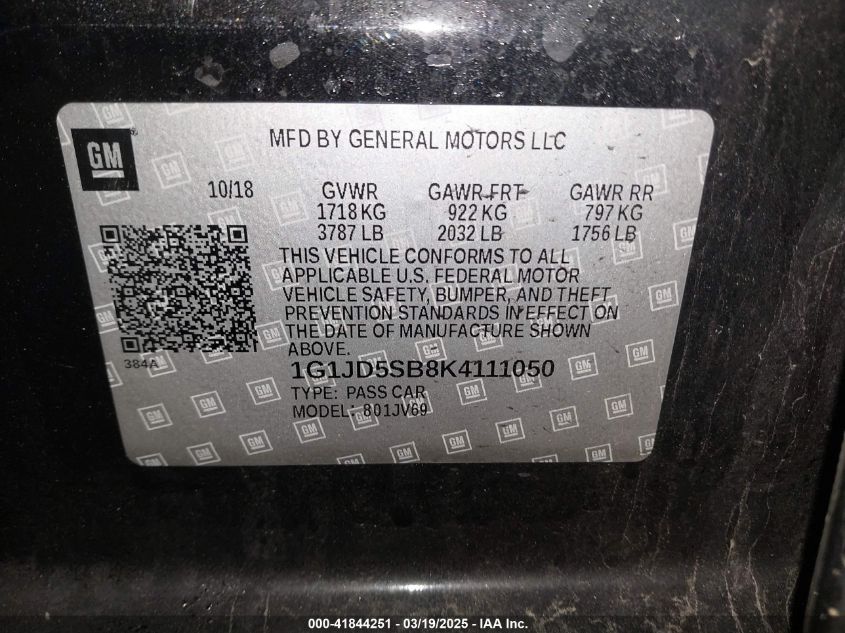 2019 CHEVROLET SONIC 2019 року Бензин, 1.4, Передний привод, vin - 1G1JD5SB8K4****** из США