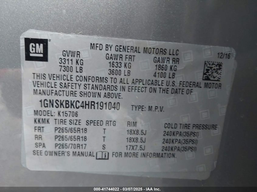Цвет СерыйЦилиндры 8Привод Полный приводVIN 1GNSKBKC4HR******Состояние НеизвестноПовреждения Передняя или задняя AutoRIA