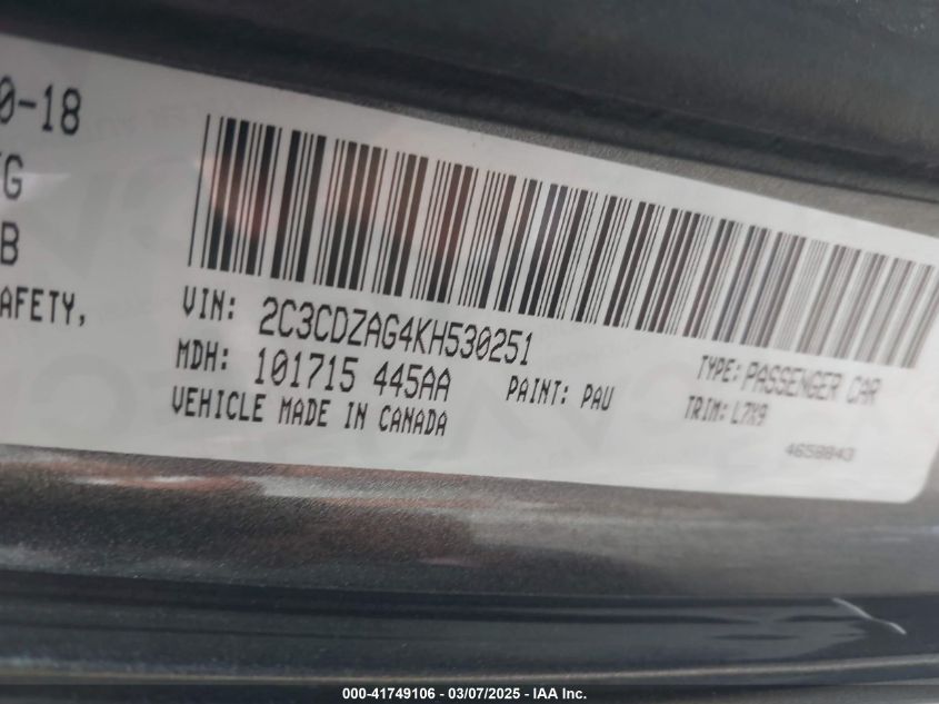 Цвет СерыйЦилиндры 6Привод Задний приводVIN 2C3CDZAG4KH******Состояние НеизвестноПовреждения Мотор AutoRIA