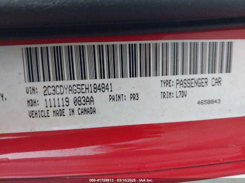 Цвет КрасныйЦилиндры 6Привод Задний приводVIN 2C3CDYAG5EH******Состояние НеизвестноПовреждения Передняя или задняя AutoRIA
