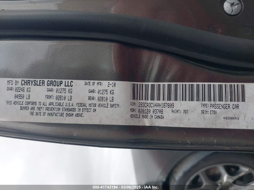 Цвет СерыйЦилиндры 6Привод Задний приводVIN 2B3CA3CV4AH******Состояние НеизвестноПовреждения Передняя левая