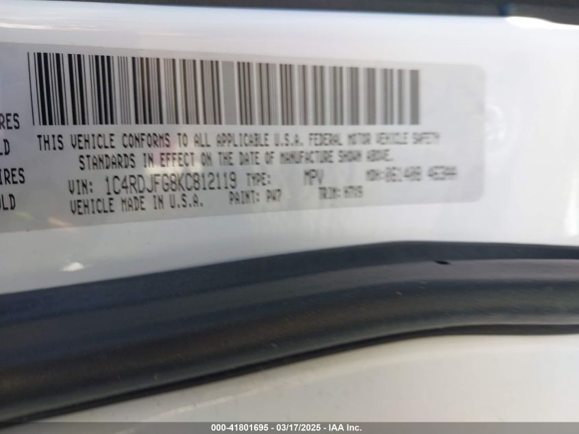 Цвет БелыйЦилиндры 6Привод Полный приводVIN 1C4RDJFG8KC******Состояние НеизвестноПовреждения Левая сторона AutoRIA