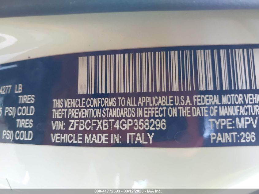 Цвет БелыйЦилиндры 4Привод Передний приводVIN ZFBCFXBT4GP******Состояние НеизвестноПовреждения Передняя или задняя AutoRIA