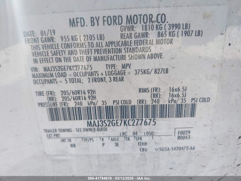 2019 FORD ECOSPORT 2019 року Бензин, 1.0, Передний привод, vin - MAJ3S2GE7KC****** из США