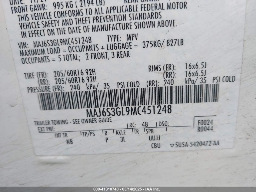 2021 FORD ECOSPORT 2021 року Бензин, 2.0, Полный привод, vin - MAJ6S3GL9MC****** из США