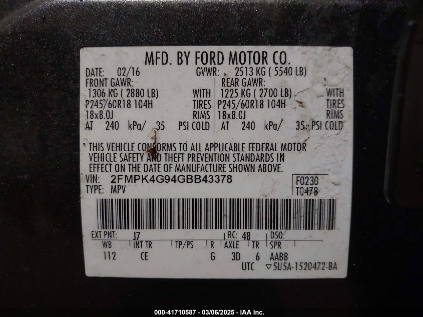 Цвет СерыйЦилиндры 4Привод Полный приводVIN 2FMPK4G94GB******Состояние НеизвестноПовреждения Левая сторона AutoRIA