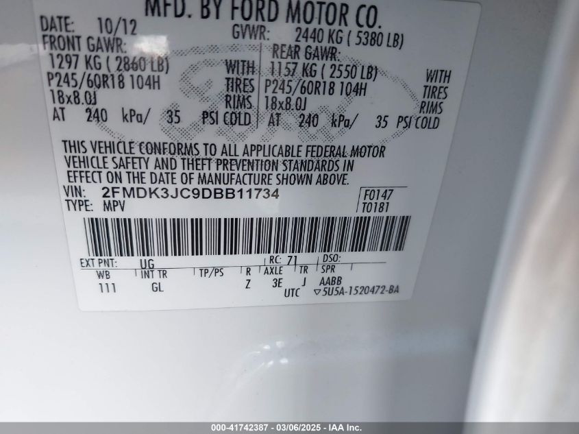 Цвет БелыйЦилиндры 6Привод Передний приводVIN 2FMDK3JC9DB******Состояние НеизвестноПовреждения Правая сторона AutoRIA