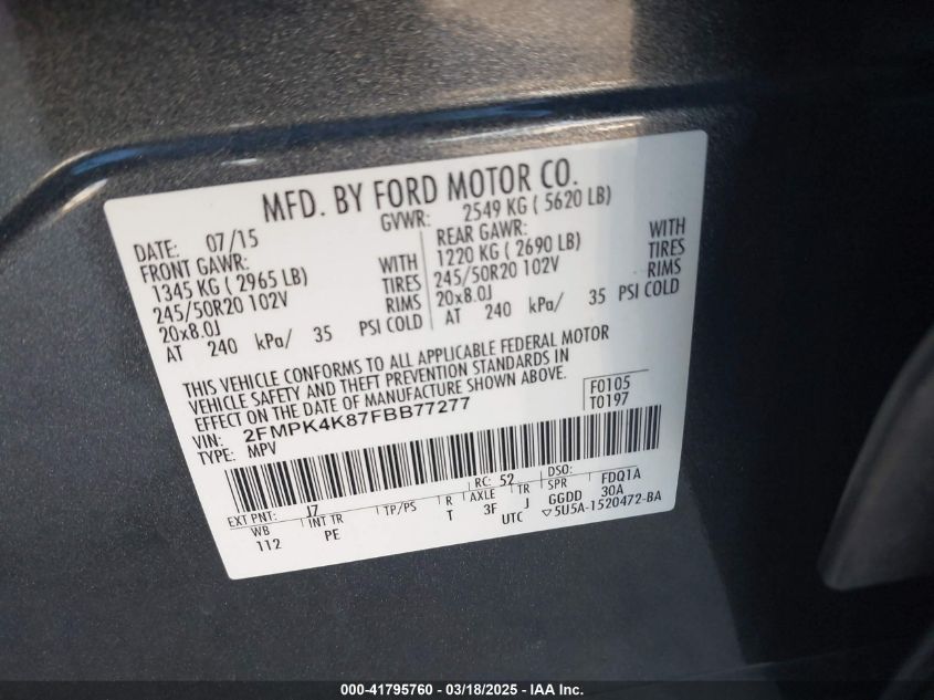 2015 FORD EDGE 2015 року Бензин, 3.5, Полный привод, vin - 2FMPK4K87FB****** из США