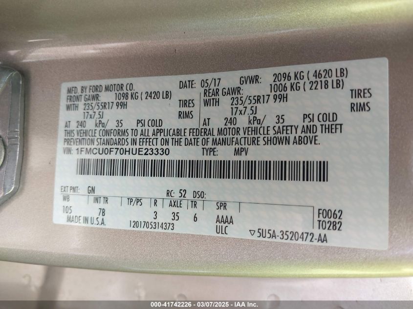 Цвет ЗолотойЦилиндры 4Привод Передний приводVIN 1FMCU0F70HU******Состояние НеизвестноПовреждения Передняя или задняя AutoRIA