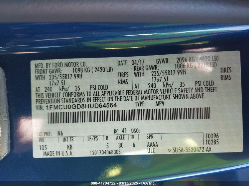 Цвет СинийЦилиндры 4Привод Передний приводVIN 1FMCU0GD8HU******Состояние НеизвестноПовреждения Задняя правая AutoRIA