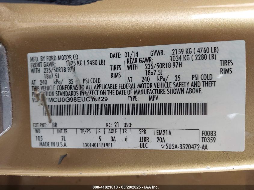 2014 FORD ESCAPE 2014 року Бензин, 2.0, Передний привод, vin - 1FMCU0G98EU****** из США