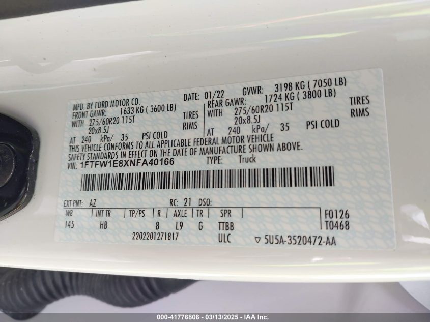 2022 FORD F-150 2022 року Бензин, 3.5, Полный привод, vin - 1FTFW1E8XNF****** из США