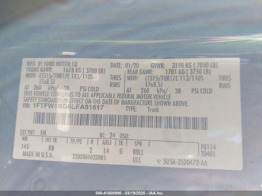 2020 FORD F-150 2020 року Бензин, 3.5, Полный привод, vin - 1FTFW1RG6LF****** из США