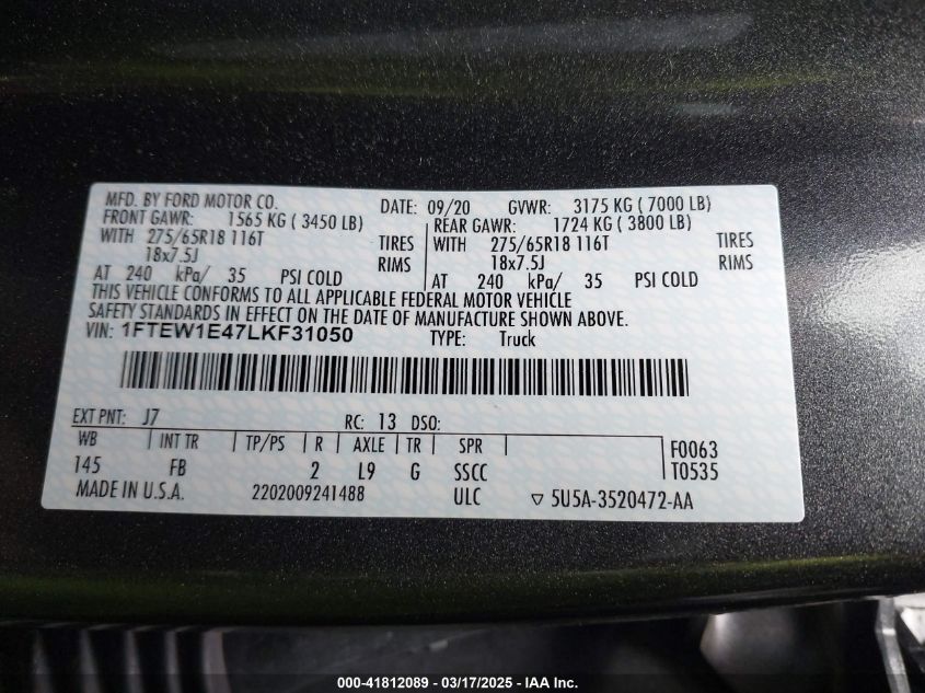 2020 FORD F-150 2020 року Бензин, 3.5, Полный привод, vin - 1FTEW1E47LK****** из США