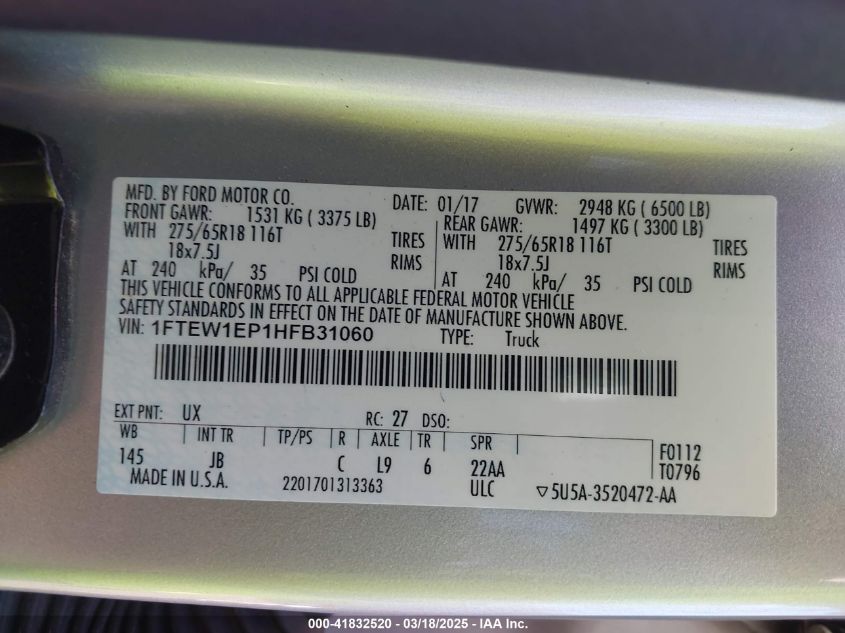 Цвет СеребряныйЦилиндры 6Привод Полный приводVIN 1FTEW1EP1HF******Состояние НеизвестноПовреждения Био/Химические AutoRIA