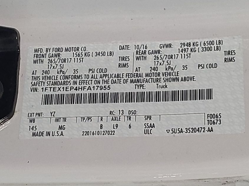 2017 FORD F-150 2017 року Бензин, 2.7, Полный привод, vin - 1FTEX1EP4HF****** из США