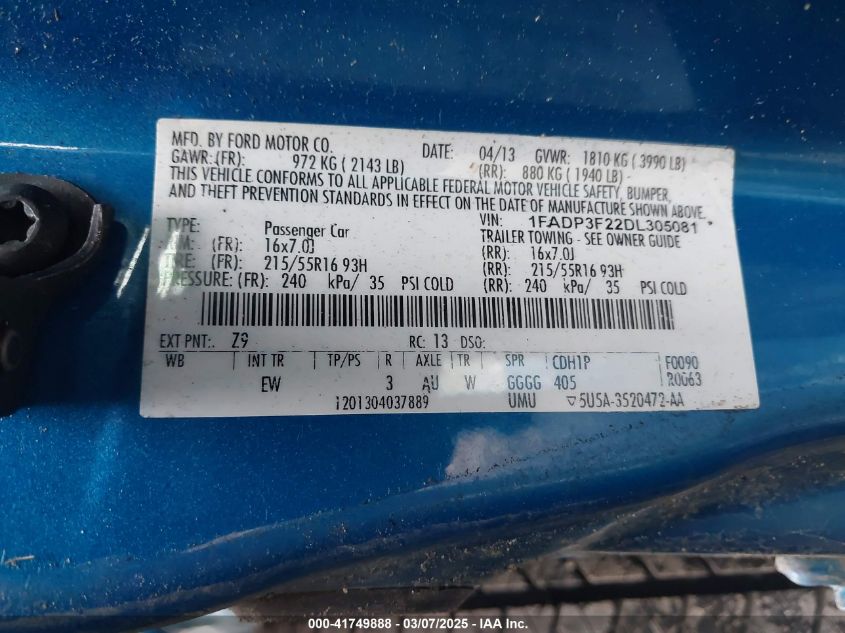 Цвет СинийЦилиндры 4Привод Передний приводVIN 1FADP3F22DL******Состояние НеизвестноПовреждения Передняя левая AutoRIA