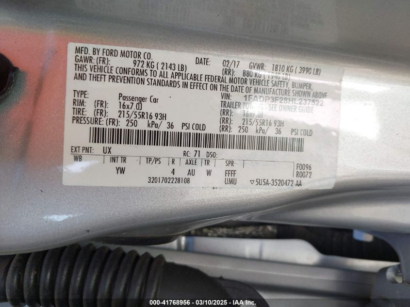 Цвет СеребряныйЦилиндры 4Привод Передний приводVIN 1FADP3F28HL******Состояние НеизвестноПовреждения НезначительныеДата аукциона 2025-03-20 AutoRIA