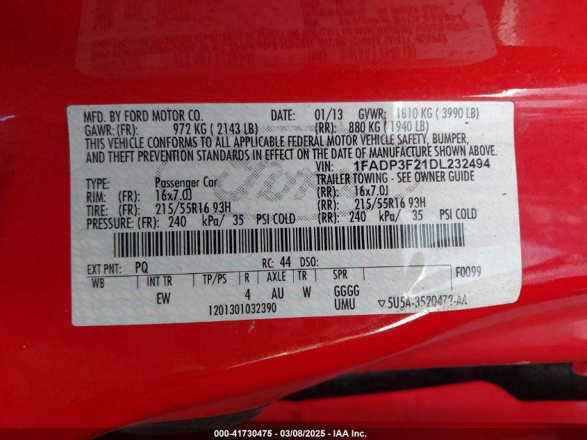 Цвет КрасныйЦилиндры 4Привод Передний приводVIN 1FADP3F21DL******Состояние НеизвестноПовреждения Неизвестно AutoRIA