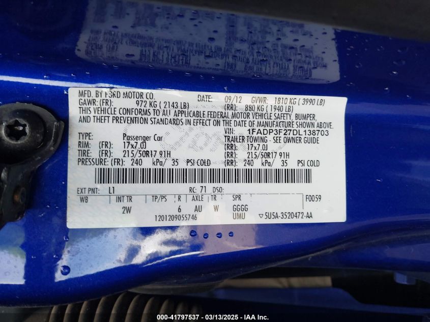 2013 FORD FOCUS 2013 року Бензин, 2.0, Передний привод, vin - 1FADP3F27DL****** из США