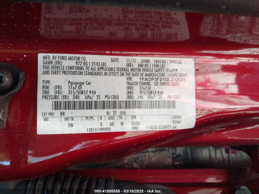 Цвет КрасныйЦилиндры 4Привод Передний приводVIN 1FADP3F21GL******Состояние НеизвестноПовреждения Левая сторона AutoRIA