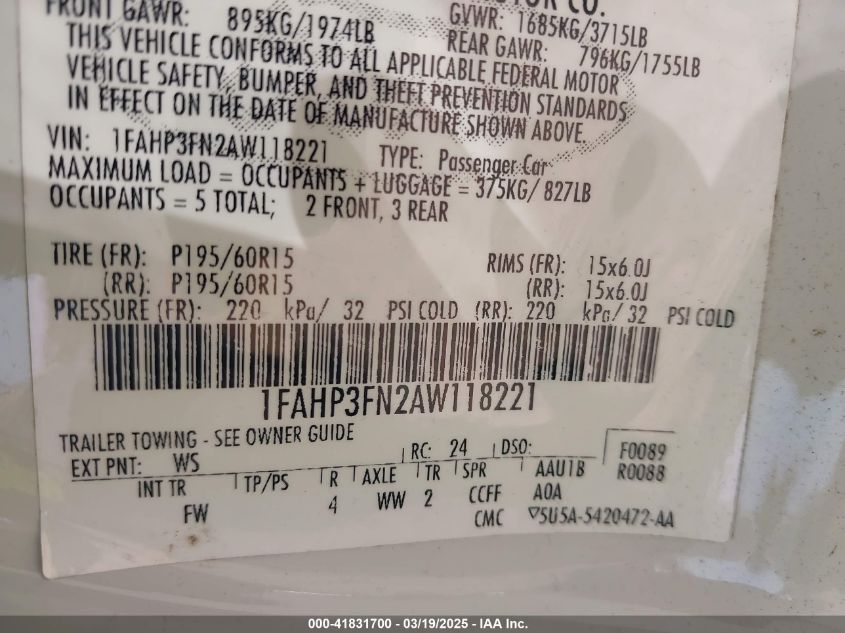 Цвет БелыйЦилиндры 4Привод Передний приводVIN 1FAHP3FN2AW******Состояние НеизвестноПовреждения Незначительные AutoRIA