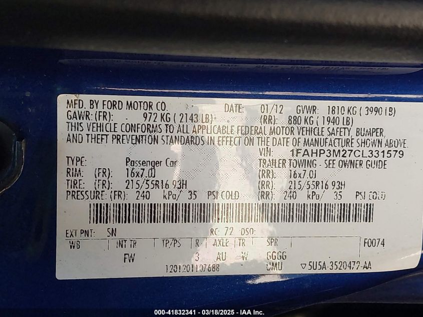 Цвет СинийЦилиндры 4Привод Передний приводVIN 1FAHP3M27CL******Состояние НеизвестноПовреждения Задняя левая AutoRIA
