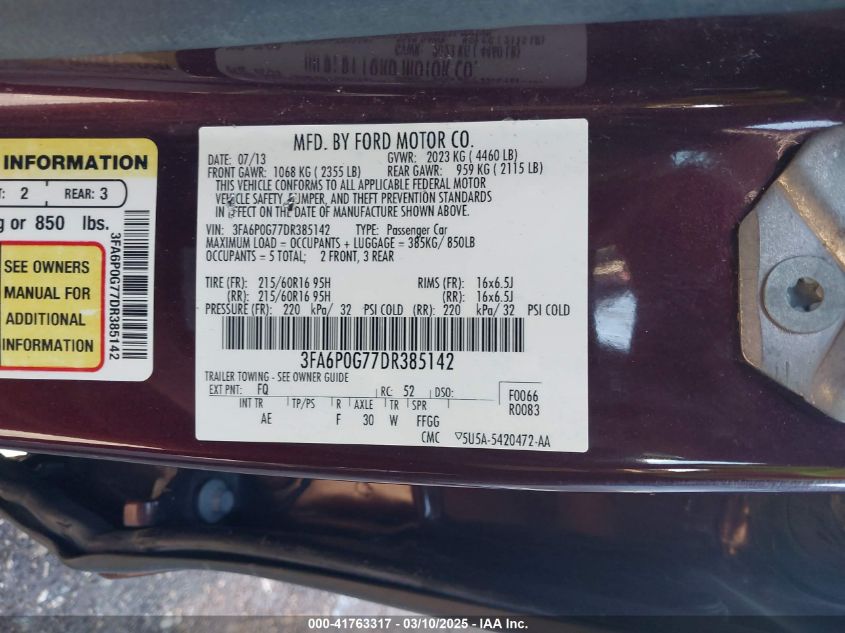 Цвет БордовыйЦилиндры 4Привод Передний приводVIN 3FA6P0G77DR******Состояние НеизвестноПовреждения НезначительныеДата аукциона 2025-03-20 AutoRIA