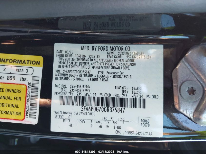 2016 FORD FUSION 2016 року Бензин, 2.5, Передний привод, vin - 3FA6P0G70GR****** из США