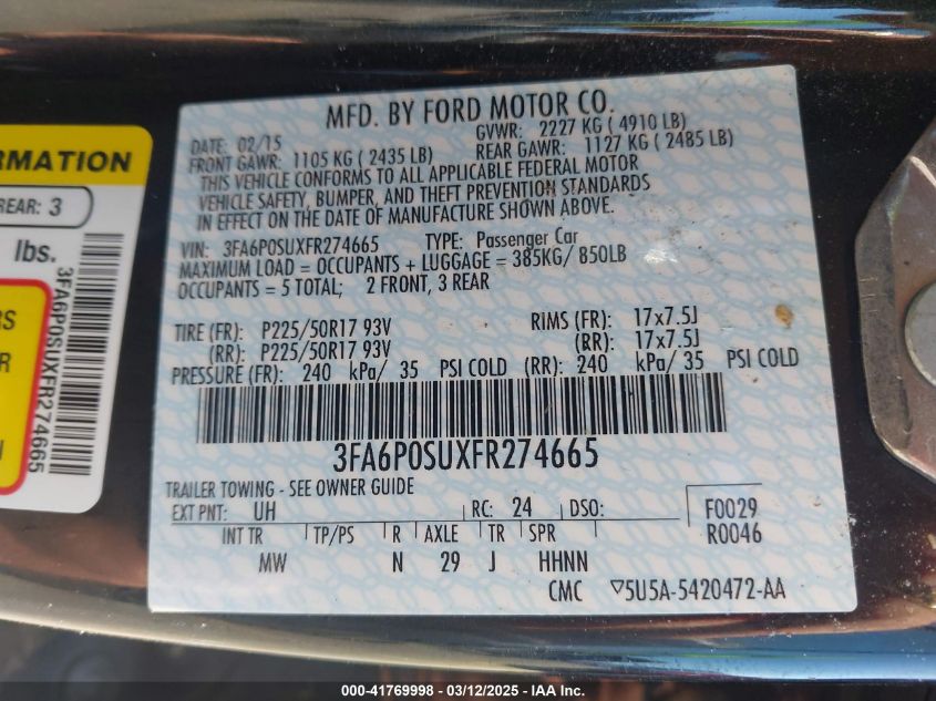 2015 FORD FUSION 2015 року Гибрид, 2.0, Передний привод, vin - 3FA6P0SUXFR****** из США