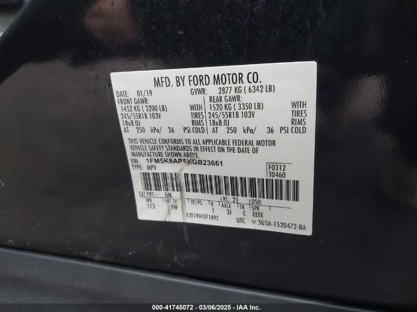 Цвет ЧерныйЦилиндры 6Привод Полный приводVIN 1FM5K8AR8KG******Состояние НеизвестноПовреждения Передняя леваяДата аукциона 2025-03-25