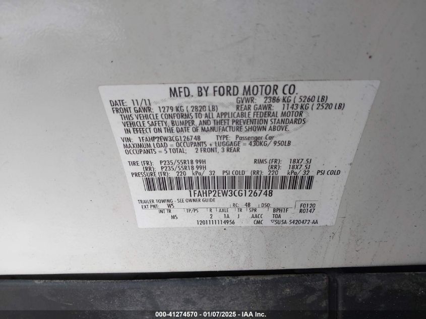 2012 FORD TAURUS 2012 року Бензин, 3.5, Передний привод, vin - 1FAHP2EW3CG****** из США