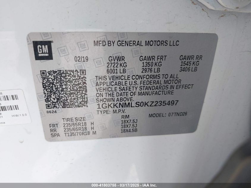 Цвет БелыйЦилиндры 6Привод Передний приводVIN 1GKKNMLS0KZ******Состояние НеизвестноПовреждения Передняя или задняя AutoRIA