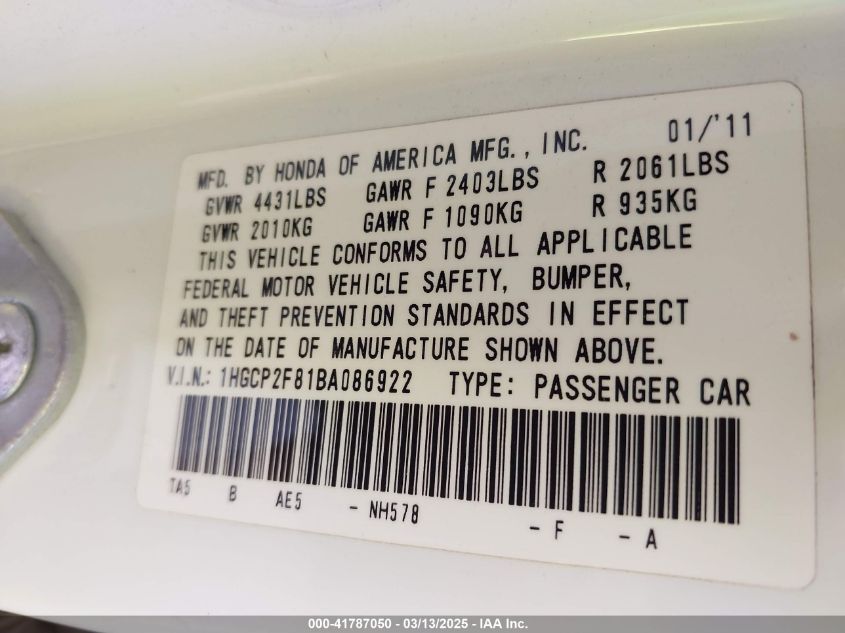 Цвет БелыйЦилиндры 4Привод Передний приводVIN 1HGCP2F81BA******Состояние НеизвестноПовреждения Передняя или задняя AutoRIA