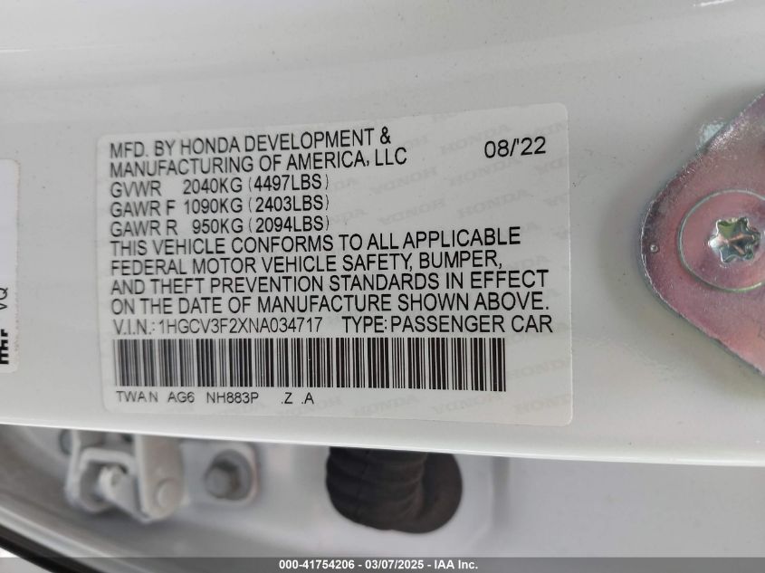 2022 HONDA ACCORD 2022 року Гибрид, 2.0, Передний привод, vin - 1HGCV3F2XNA****** из США