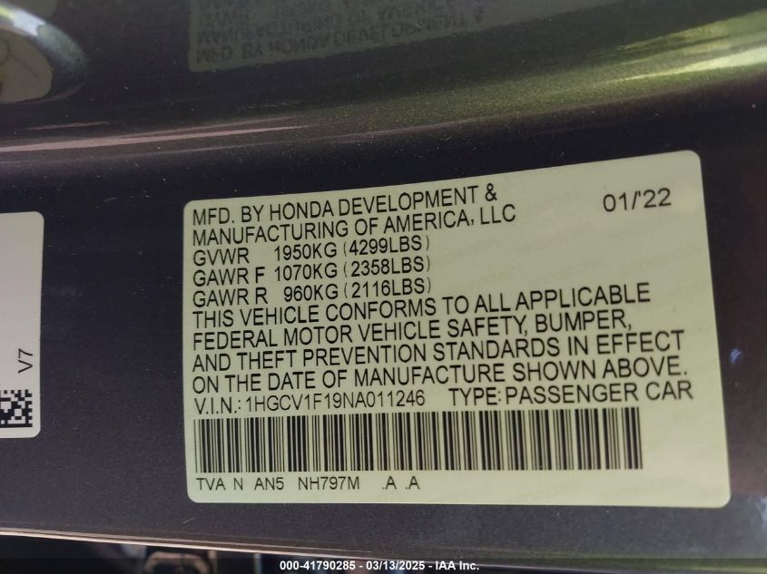 2022 HONDA ACCORD 2022 року Бензин, 1.5, Передний привод, vin - 1HGCV1F19NA****** из США